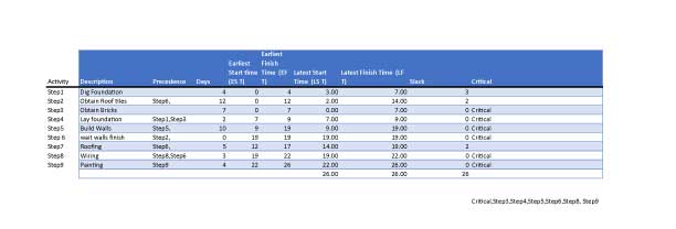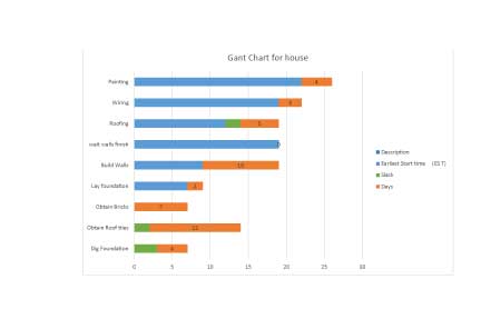 The beauty of this lay out is is simplicity. The macros will calculate the time values if one changes one value in the table the rest will automatically update. if one changes a element in the process it is easily added in one can see the results immediately. One can link a Gant chart to these tables that will high lighten whatever one wishes to analyze! In this case I showed the slack an important aspect in the planning process, for it something one can take advantage of or one tries to make it disappear. Example like the time delay waiting for roofing to start.