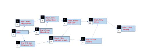 Lets start with simple pencil and paper this image shows the necessary planning steps for a simple house. Each step, or line represents a time value, note in this example the dashed line represent 0 time value essentially describing a delay in the process. In this case the walls of the house have to be completed before the roof is started. the square boxes attached show the calculations for forward pass and back ward pass. This is what it looks like if one manually calculates the values. Normally this would be some quick scribbles in my notebook especially for such simple layout.
