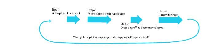 Example: Unloading a truck with 30 bags, place in designated area. One bag per trip. Return to truck empty. 30 loaded trips truck unloaded. total trips 60 each trip one minute. So 60 minutes to unload truck. Next step is checking ones logic is it sound? There are several ways!